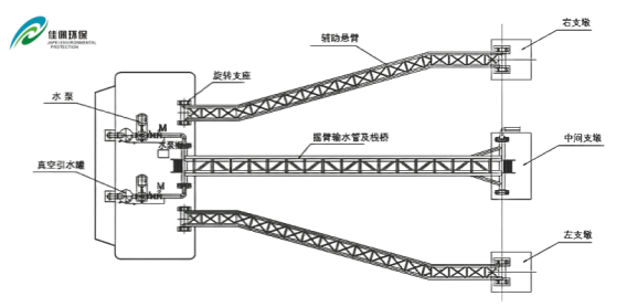 3. 輔助搖臂式浮動(dòng)泵站:水位落差≤20m風(fēng)力較大,船體不適合拋錨定位的情況下,采用主輔架旋臂定位。增強(qiáng)了系統(tǒng)的穩(wěn)定性和適應(yīng)性。當(dāng)水位快速變化或水流沖擊力較大時(shí),輔助搖臂可分擔(dān)部分壓力,確保輸水管與取水口的可靠連接,提高取水的穩(wěn)定性和可靠性,適用于水位落差大且水流復(fù)雜的水域。