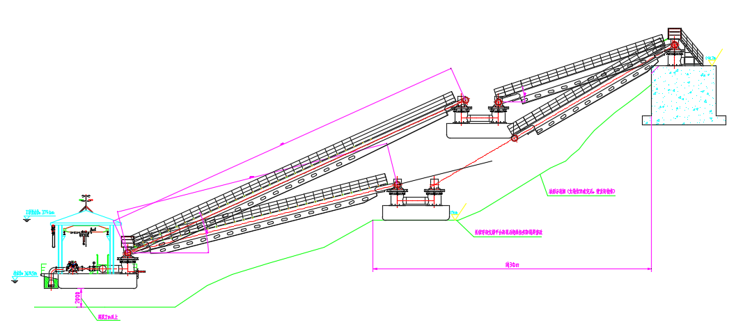 2. 高落差單級搖臂式固定泵站:適用于取水點(diǎn)水位落差20m~30m較大的,取水點(diǎn)距離岸邊支墩距離 ≤50m的,人行走道雙級懸橋式安裝場景。其特點(diǎn)是通過單級搖臂連接輸水管,結(jié)構(gòu)相對簡單,能適應(yīng)較大的水位變化幅度。但對搖臂的強(qiáng)度和穩(wěn)定性要求高,可在落差較大且水流相對平穩(wěn)的江河取水,通過調(diào)整搖臂角度,保證取水口始終處于合適水位。