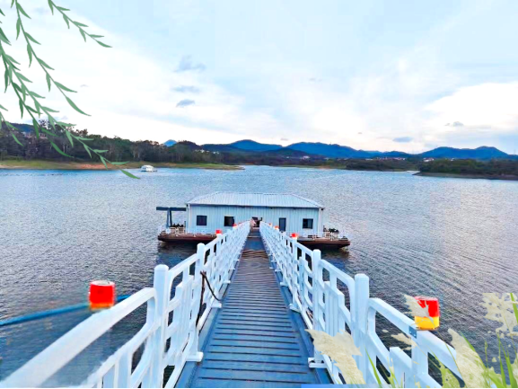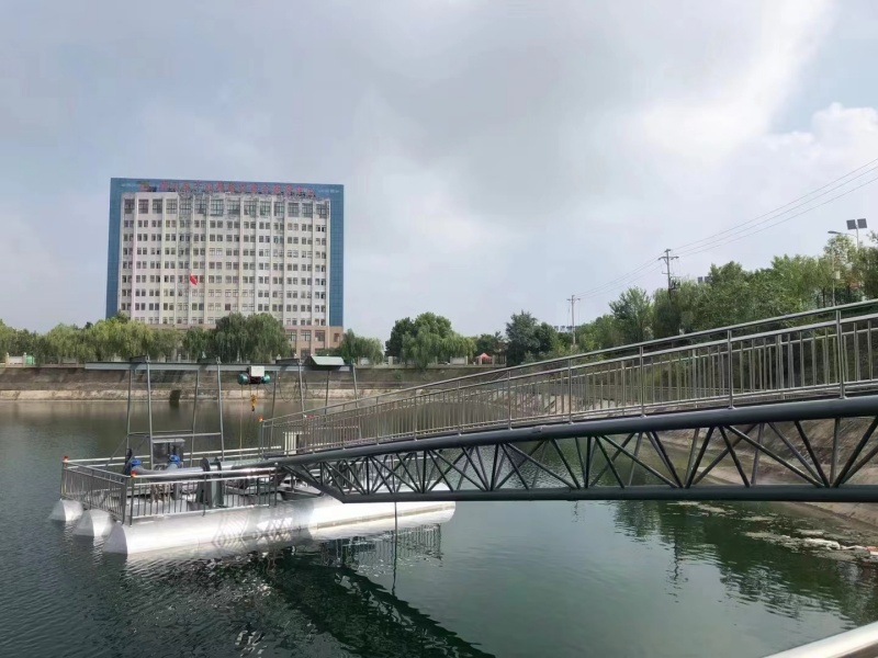 6. 浮橋式泵站:通過浮橋連接岸邊與泵站主體,輸水管鋪設(shè)在浮橋上,這種結(jié)構(gòu)穩(wěn)定性好,主要適用于水位變化頻率低,流速較慢,風(fēng)速不大,岸坡較平坦的工況。特點(diǎn),浮橋可起到支撐和導(dǎo)向作用,便于輸水管的布置和維護(hù),同時(shí)也方便人員和設(shè)備在岸邊與泵站間通行。
